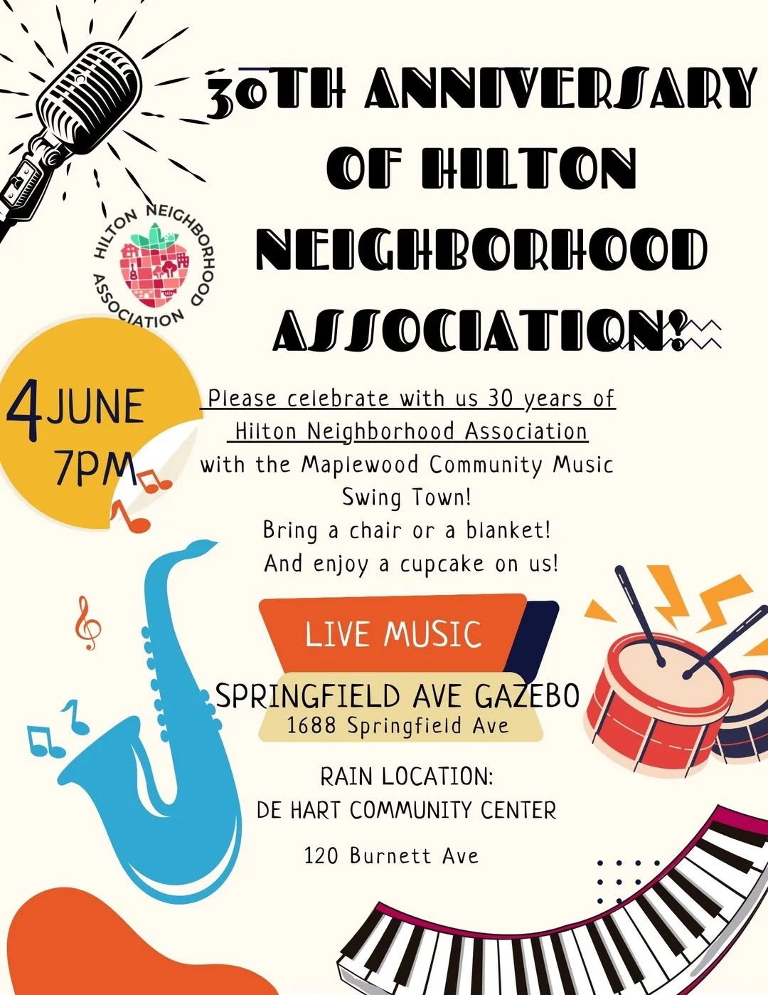 Celebrate 30 years of Hilton Neighborhood Association with the Maplewood Community Music Swing Town. Bring a chair or blanket and enjoy a complimentary cupcake.
