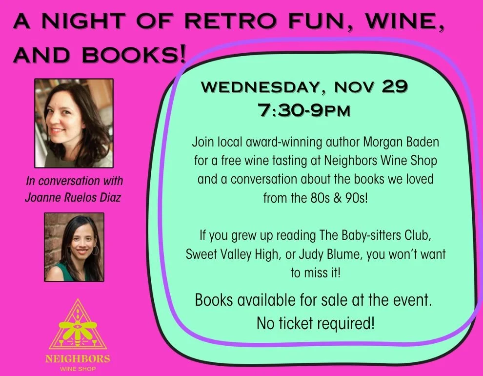 Join local award-winning author Morgan Baden for a conversation about 80s and 90s books and a free wine tasting at Neighbors Wine Shop.