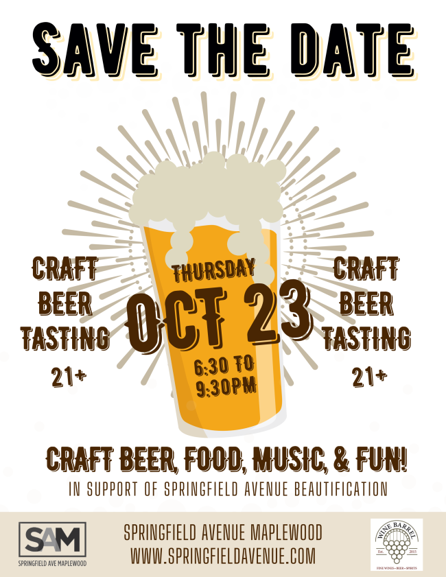Support the beautification of Springfield Avenue while enjoying unlimited samples many of our area’s most delicious craft beers. Enjoy hanging with friends and neighbors in the parking lot at the Wine Barrel.