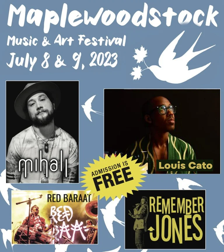 Maplewoodstock Saturday, July 8, 2023 12:00 PM 10:00 PM 12:00 22:00 Memorial Park Maplewood, NJ 07040 (map) Google Calendar ICS Headliners: Mihali and Louis CatoFeatured Acts: Red Baraat and Remember Jones.Full line-up, map, tent canopy info and more.