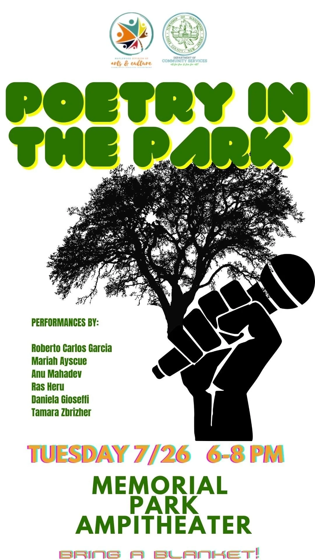Performances by Roberto Carlos Garcia, Mariah Ayscue, Anu Mahadev, Ras Heru, Daniela Gioseffi and Tamara Zbrizher. Bring a blanket or chair. Free. More info.