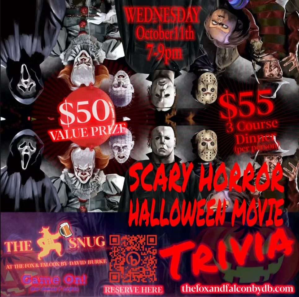 Scary Horror Halloween Movie Trivia hosted by Fox and Falcon on Oct. 11th from 7pm to 9pm.