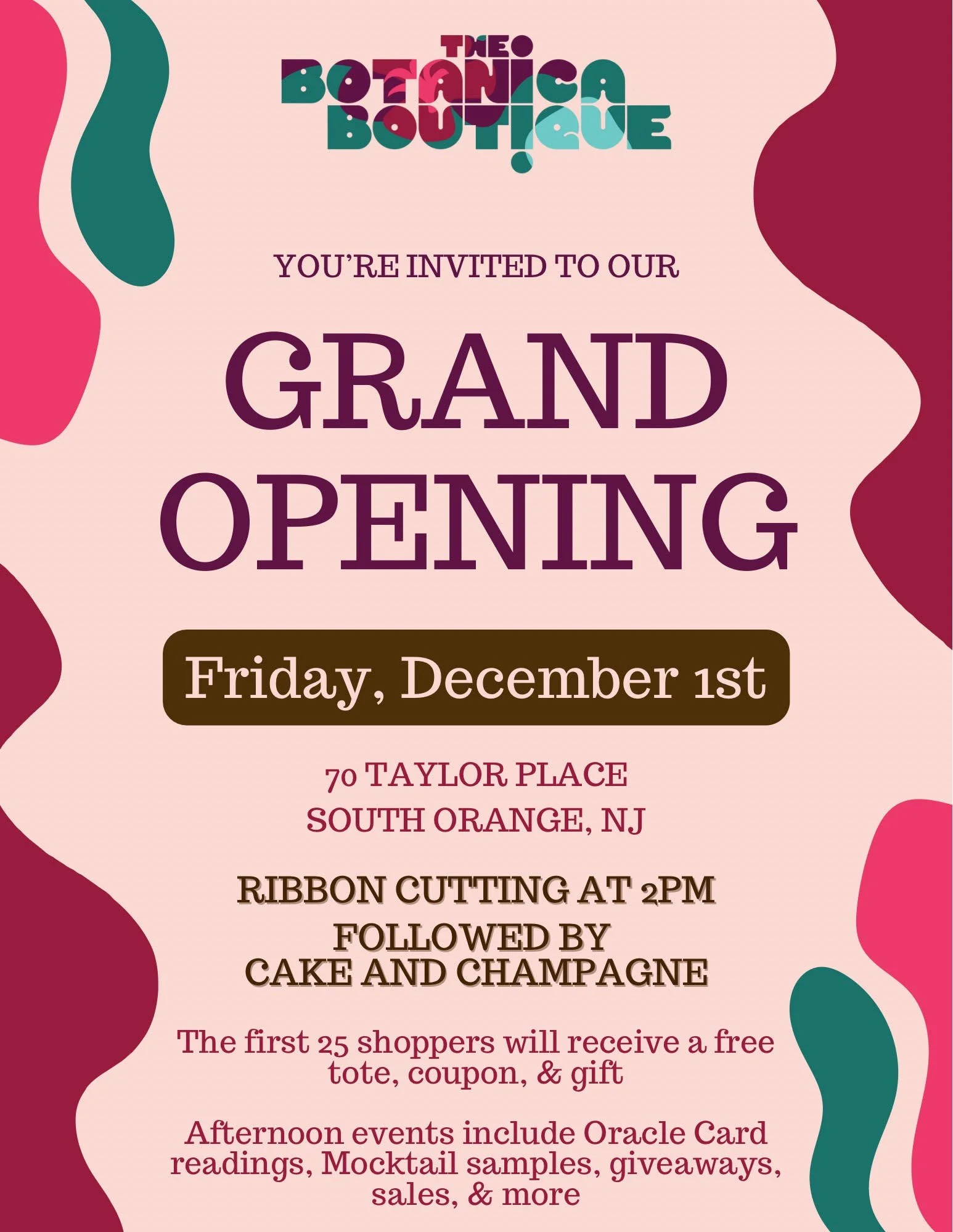First 25 shoppers get a free tote, coupon, and gift. Oracle Card Readings, mocktail samples, and specials.